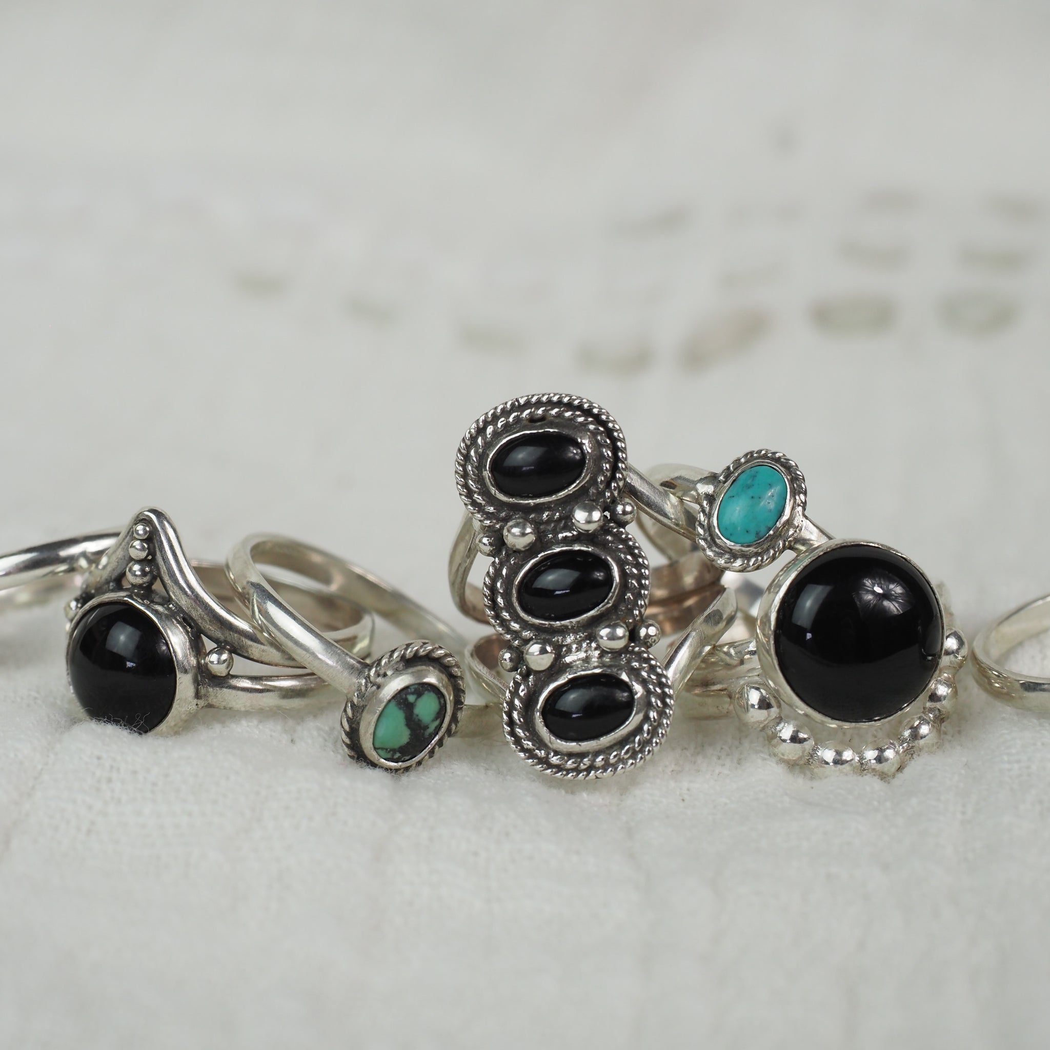 This bold sterling silver ring features three polished black onyx stones set in a vertical row. Twisted rope detailing and silver bead accents frame each stone, creating a striking balance of texture and shine. A statement piece with timeless appeal.