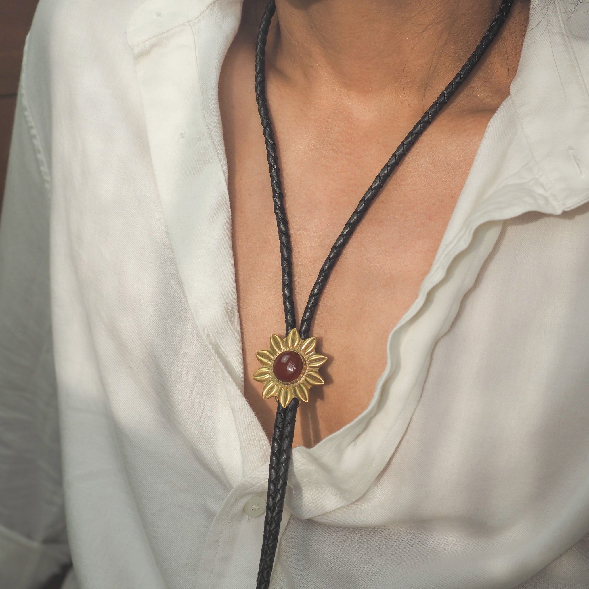 Floral and fire meets timeless western style in this bolo tie. At its center sits a glowing carnelian cabochon, a stone long cherished for its grounding energy and bold, sunlit hue. The gem is framed by a brass sunburst, radiating strength and vitality with every detail. Set on braided black leather adorned with brass tips, this piece carries both rugged charm and refined artistry. Whether worn at the collar or draped more loosely, it’s a statement of confidence—perfect for those who walk with both grit and grace.